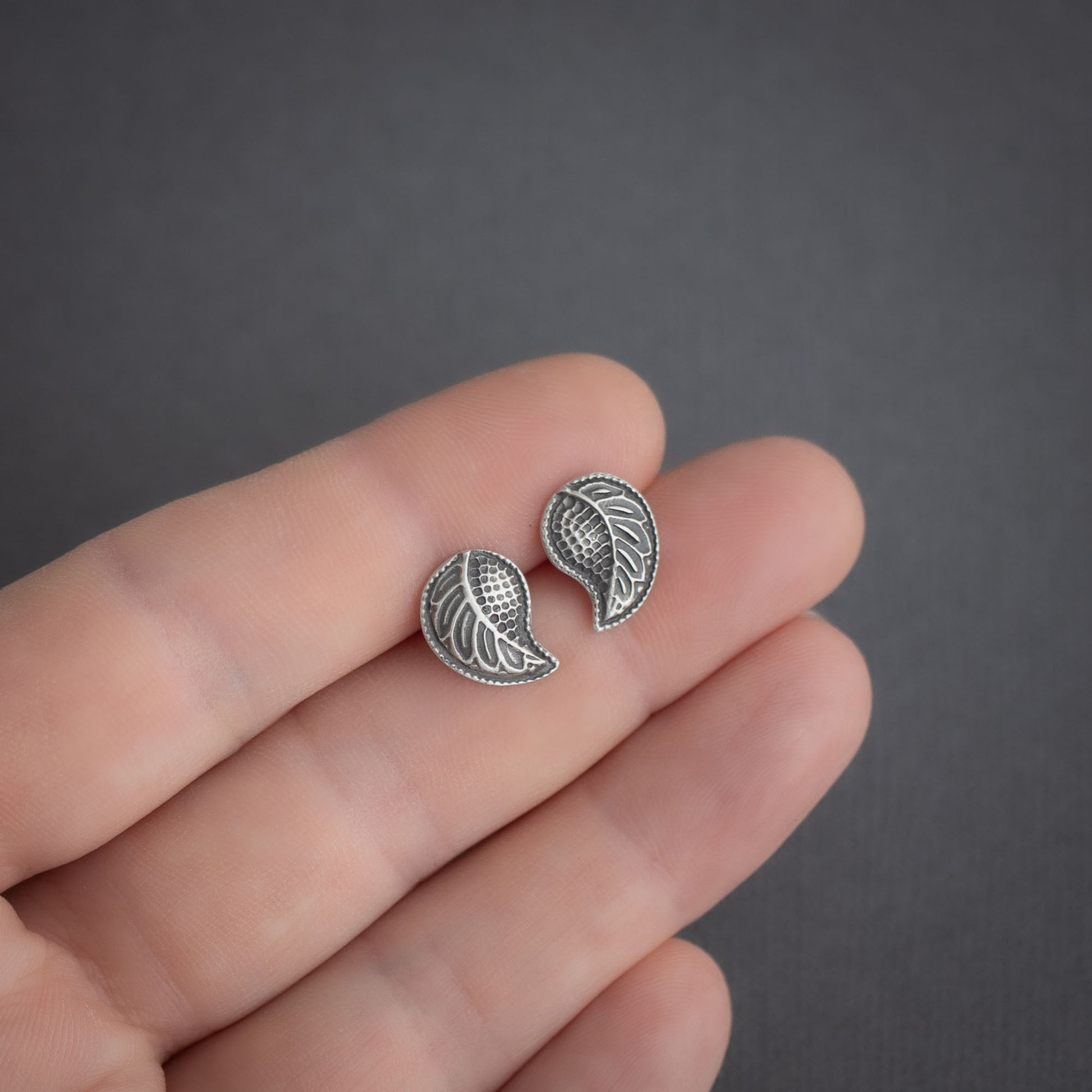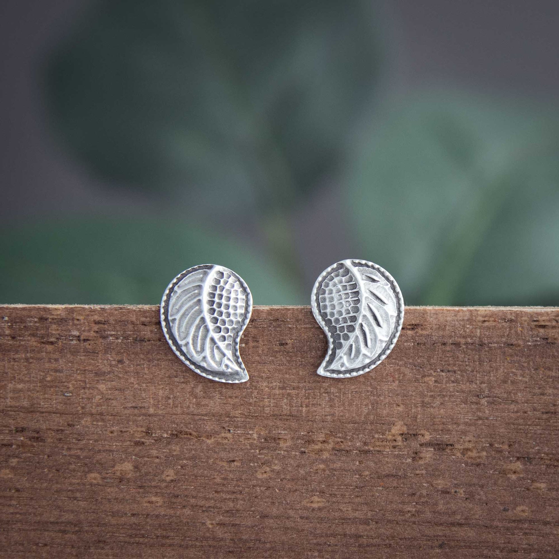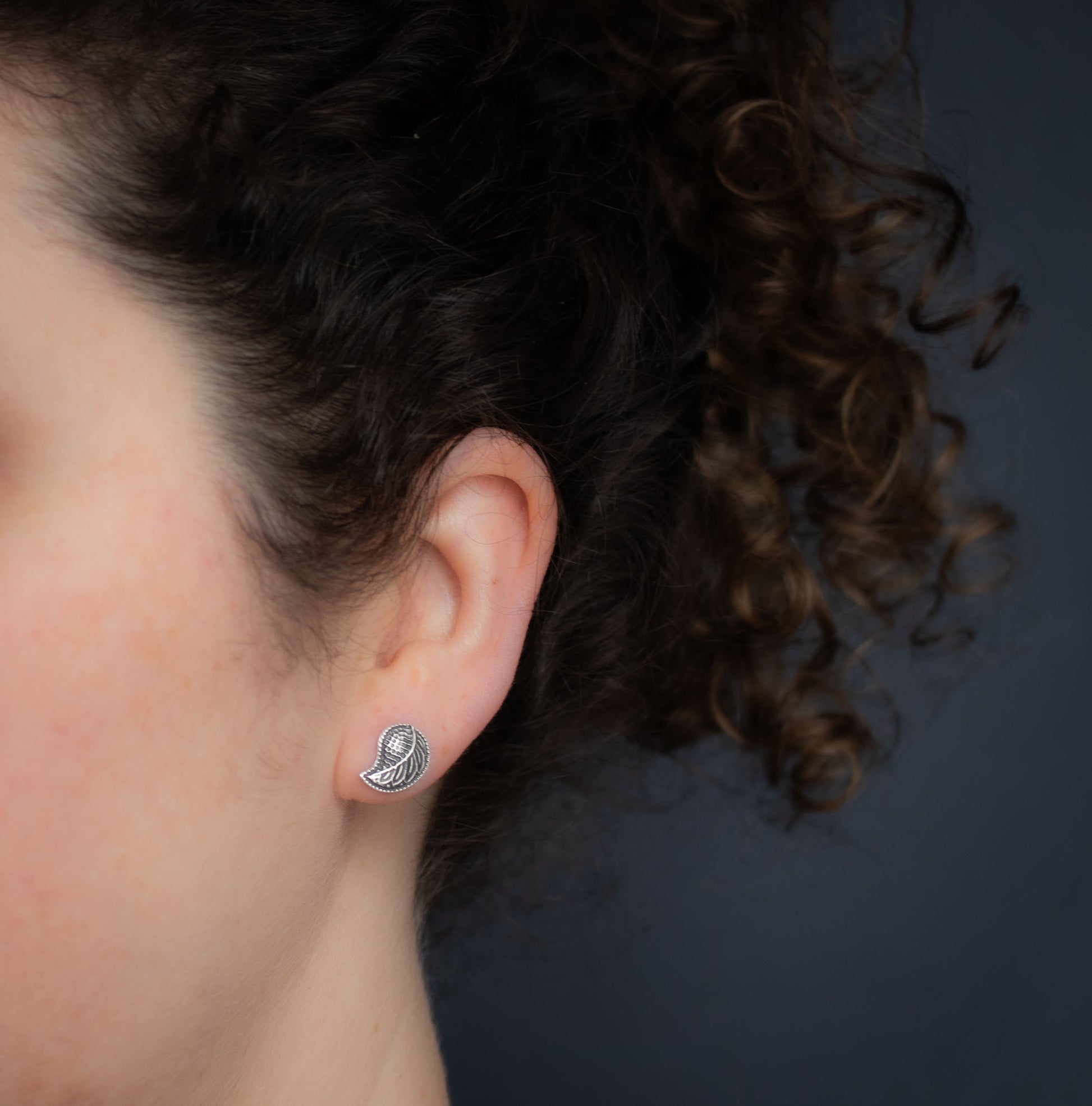 Perfect paisley studs impressed with an antique die. The posts are secured with nickel-free solder to reduce irritation for sensitive ears. Each pair is meticulously handcrafted through forming, sculpting, kiln firing, soldering, polishing, and oxidizing, enhancing depth and contrast. Made of sterling silver, measuring 13x10mm.