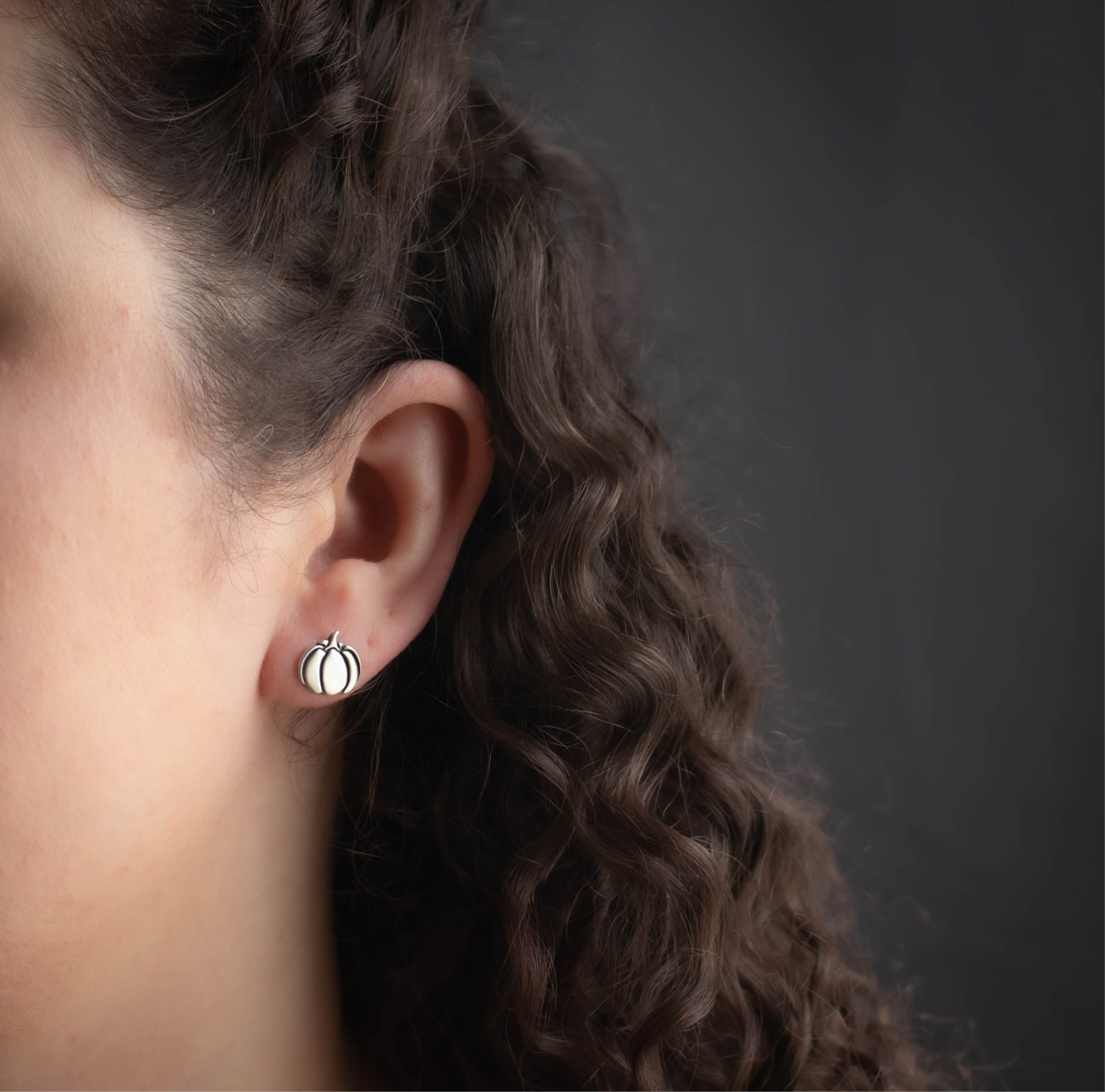 These petite pumpkin studs are perfect for fall. The posts are secured with nickel-free solder to reduce irritation for sensitive ears. Each pair is meticulously handcrafted through forming, sculpting, kiln firing, soldering, polishing, and oxidizing, enhancing depth and contrast. Made of sterling silver, measuring 11x11mm.